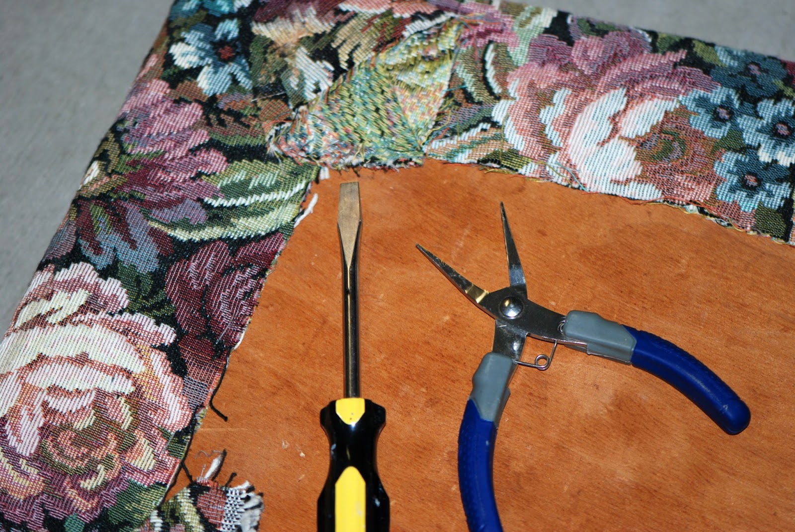 Remove old fabric Use pliers or a screwdriver to remove staples or nails that are holding down the fabric. My piece had two layers of fabric as it had been previously recovered. I removed the top layer and kept the bottom layer