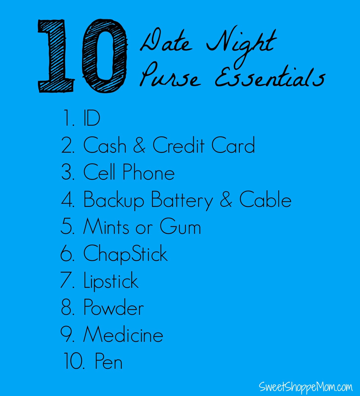 Step 1: Create a list of your date night essentials Decide what are your essentials for your date night purse. Type the list, save on your computer and print a copy. I keep a small printed checklist in my closet of my purse (daytime and evening) contents so I don’t forget everything. It’s good to routinely check to see what needs to be restocked and what has migrated to other parts of the house.