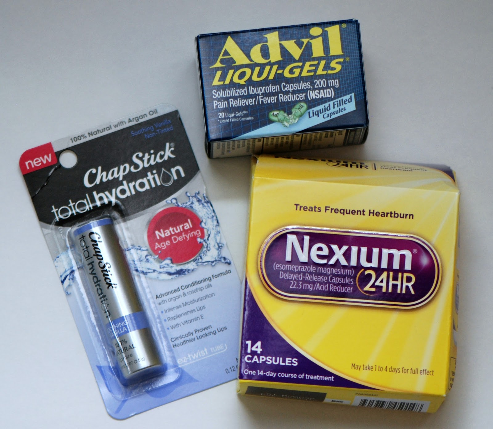 I picked my up date night purse essentials at my local Walmart. I found the ChapStick Total Hydration, Advil Liqui-Gels and Nexium 24HR all in the pharmacy section of the store.