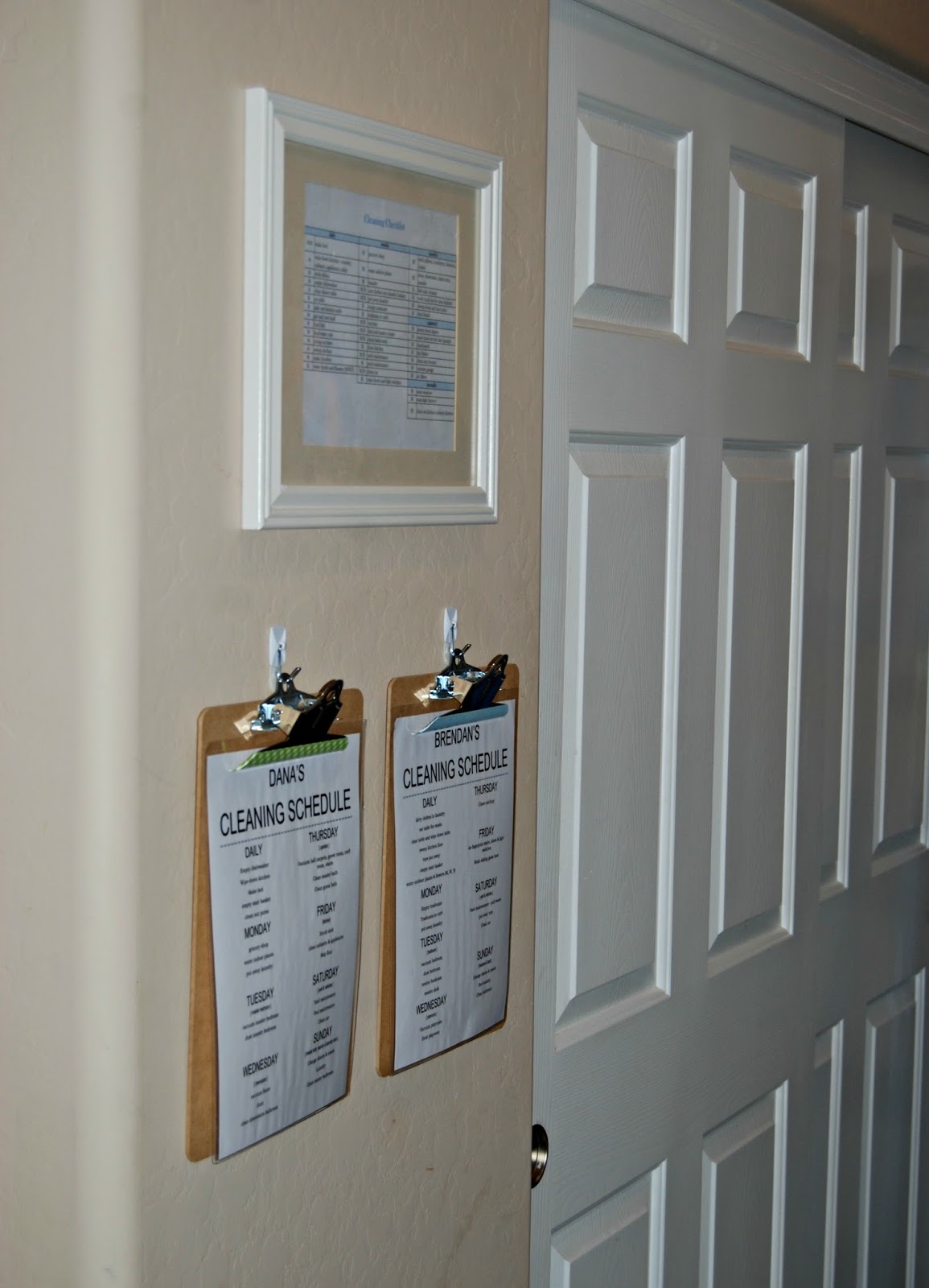 Step 3: Print and hang the master list and the weekly chore lists I created a master chart which I hung on the wall in a frame – the glass frame allows me to use a dry erase marker to mark off the monthly, quarterly and annual chores. There’s a small hallway between my kitchen and living room/dining room that I’ve turned into a mudroom/command center. One side has hooks for coats and bags along with a bench. I’ve hung hooks for my car keys, incoming and outgoing mail slots, and chore charts.
